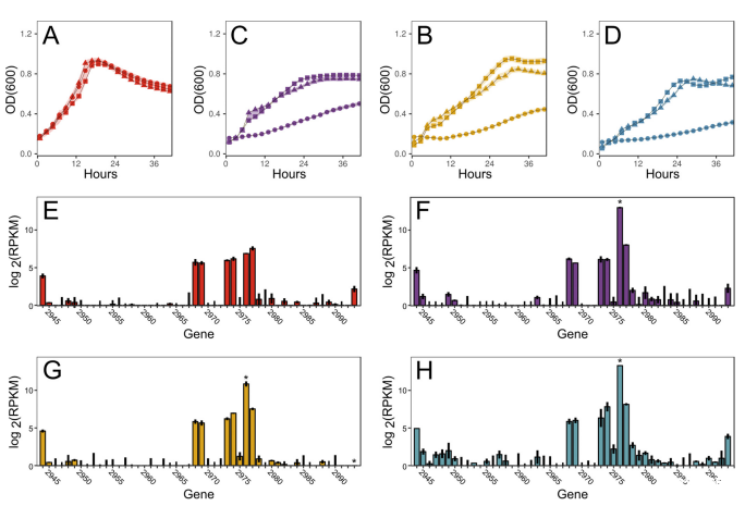 圖4、C.phytofermentans WT、DI-SS與Del-SS的生長曲線。在葡萄糖(A)、纖維二糖(B)、木糖(C)、半乳聚糖(D)上測量。數(shù)據(jù)點(diǎn)為4個培養(yǎng)物均值,陰影區(qū)為標(biāo)準(zhǔn)差(SD)。(E-H)RNA-seq測量WT在不同碳源條件下cphy2944-cphy2993的mRNA表達(dá)(log2(RPKM)±SD,重復(fù)培養(yǎng)物);星號表示相對于葡萄糖的差異表達(dá)基因。