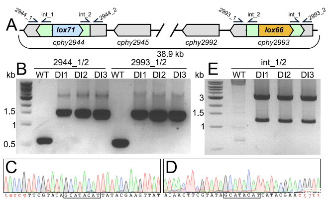 圖2、在C.phytofermentans中構(gòu)建targetron插入lox71(cphy2944)與lox66(cphy2993)株。(A)基因組區(qū)域及l(fā)ox盒targetron插入位點(diǎn)。顯示B與E面板使用的引物位置。(B)對3個DI-AS分離株(DI1-DI3)通過PCR確認(rèn)lox71插入cphy2944(引物2944_1/2)與lox66插入cphy2993(引物2993_1/2)。(C-D)DI1的DNA測序色譜圖:cphy2944中l(wèi)ox71位點(diǎn)(C),cphy2993中l(wèi)ox66位點(diǎn)(D),紅色顯示臂突變,8-bp中央間隔標(biāo)出。(E)逆向PCR(引物int_1/2)顯示3個DI-AS分離株僅含預(yù)期的2個基因組targetron插入。3.5 kb條帶對應(yīng)cphy2944插入,1.3 kb條帶對應(yīng)cphy2993插入。