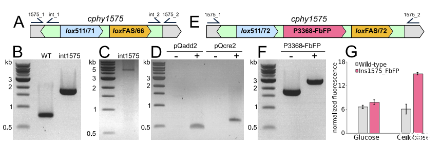 圖5、C.phytofermentans中RMCE基因組插入。(A)int1575株cphy1575區(qū)域示意圖,包括PCR引物位置(1575_1/2)及targetron數(shù)目(int_1/2)。(B)PCR顯示W(wǎng)T與int1575株(引物1575_1/2)中targetron含lox511/71-loxFAS/66盒的插入。(C)int1575基因組逆向PCR(引物int_1/2)顯示僅有單個targetron插入,5.1 kb條帶對應(yīng)預(yù)期cphy1575插入。(D)pQadd2與pQcre2可在int1575株中共存,通過PCR檢測質(zhì)粒復(fù)制子來源,比較轉(zhuǎn)移前后狀態(tài)。(E)int1575_FbFP株中cphy1575區(qū)域示意圖,顯示RMCE插入P3368-FbFP盒。(F)PCR顯示P3368-FbFP盒成功插入int1575_FbFP。(G)熒光測定(激發(fā)448/20 nm,發(fā)射495/20 nm)顯示W(wǎng)T與int1575_FbFP株纖維二糖誘導(dǎo)表達(dá)FbFP,條形圖為三重復(fù)培養(yǎng)的平均熒光值標(biāo)準(zhǔn)化OD600±SD。