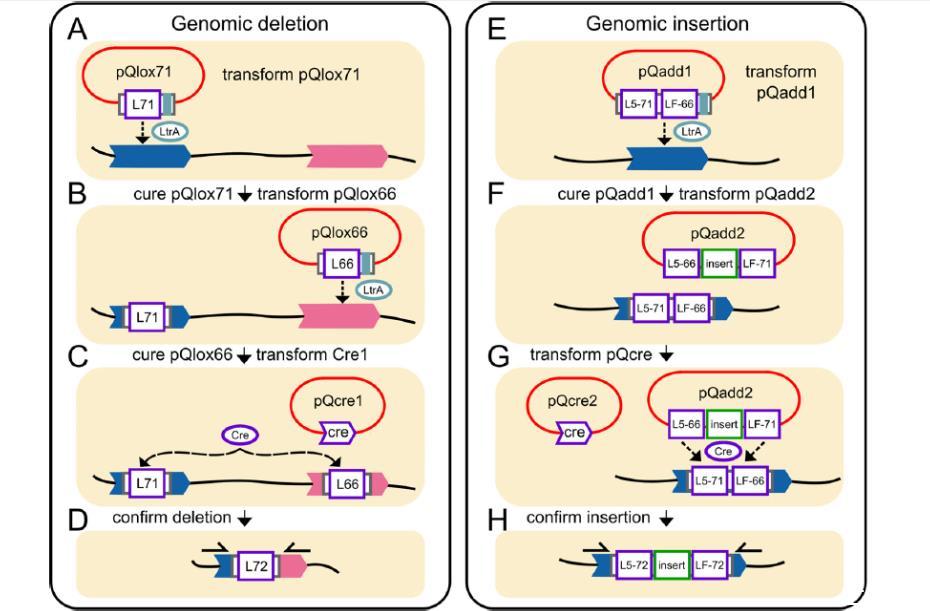 圖1、C.phytofermentans基因組缺失與插入概覽.(A)pQlox71引入,通過targetron編碼的LtrA蛋白在基因組中插入lox71(L71)位點(diǎn)。(B)pQlox71清除后,引入pQlox66,在基因組中插入lox66(L66)位點(diǎn)。(C)pQlox66清除后,引入pQcre1,Cre介導(dǎo)重組刪除lox66與lox71位點(diǎn)間的序列。(D)通過PCR確認(rèn)缺失和lox72位點(diǎn)(箭頭表示引物位置)。(E)引入pQadd1,將lox511/71(L5-71)和loxFAS/66(LF-66)盒送入基因組。(F)pQadd1清除后,引入pQadd2,攜帶目標(biāo)插入序列,位于lox511/66(L5-66)和loxFAS/71(LF-71)位點(diǎn)之間。(G)引入pQcre2,實現(xiàn)Cre介導(dǎo)的RMCE。(H)得到的株基因組中插入序列被lox511/72(L5-72)和loxFAS/72(LF-72)夾持,通過PCR確認(rèn)(箭頭表示引物)。