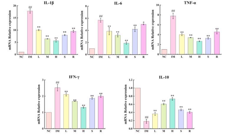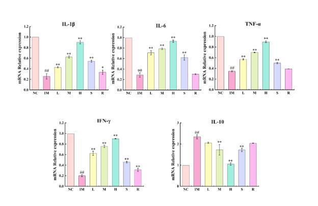 圖5、副干酪乳桿菌JY091和蜂王漿對(duì)小鼠脾細(xì)胞炎癥因子基因表達(dá)的影響。與NC組相比,IM組促炎因子IL-1β、IL-6、TNF-α、IFN-γ的mRNA表達(dá)顯著降低,抗炎因子IL-10的mRNA表達(dá)顯著升高(P<0.01)。與IM組相比,L、M、H、S、R組均能增加促炎因子的mRNA表達(dá),并不同程度地抑制抗炎因子的mRNA表達(dá),其中M、H、S組效果顯著(P<0.01)。LR可以通過(guò)調(diào)節(jié)體內(nèi)和體外細(xì)胞因子的表達(dá)水平來(lái)促進(jìn)機(jī)體產(chǎn)生免疫反應(yīng),從而促進(jìn)免疫反應(yīng)。