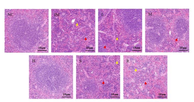 圖3.小鼠脾臟的HE染色。黃色箭頭代表中性粒細(xì)胞浸潤(rùn)。紅色箭頭代表多核巨噬細(xì)胞,放大倍數(shù)為200倍