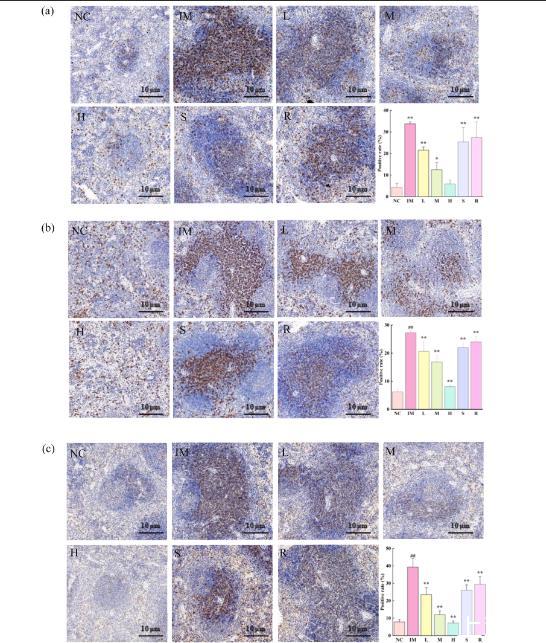 圖 4、(a) 副干酪乳桿菌 JY091 和蜂王漿對(duì)小鼠脾臟 T 淋巴細(xì)胞亞群 CD3+ 的影響,(b) 副干酪乳桿菌 JY091 和蜂王漿對(duì)小鼠脾臟 T 淋巴細(xì)胞亞群 CD4+ 的影響,(c) 副干酪乳桿菌 JY091 和蜂王漿對(duì)小鼠脾臟 T 淋巴細(xì)胞亞群 CD8+ 的影響。放大倍數(shù)為 200 倍。??表明不同模型組間差異有統(tǒng)計(jì)學(xué)意義(P < 0.01)。?表明不同模型組間差異有統(tǒng)計(jì)學(xué)意義(P < 0.05)。## 表明正常組與模型組比較,差異有統(tǒng)計(jì)學(xué)意義(P < 0.01)。# 表明正常組與模型組比較,差異有統(tǒng)計(jì)學(xué)意義(P < 0.05)。