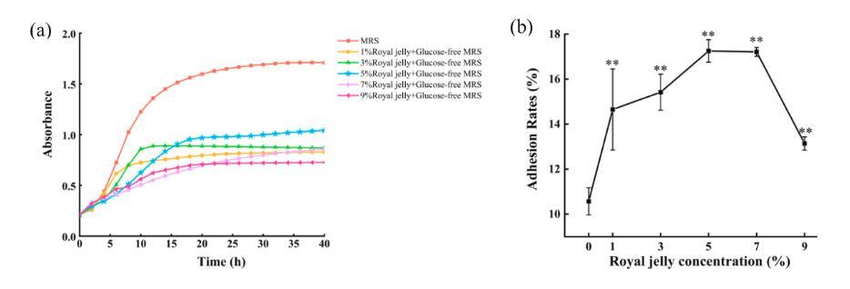 圖1、(a)不同蜂王漿濃度下副干酪乳桿菌JY091的生長(zhǎng)曲線,(b)不同蜂王漿濃度對(duì)副干酪乳桿菌JY091黏附率的影響。??表明不使用蜂王漿組與使用蜂王漿組比較,差異有統(tǒng)計(jì)學(xué)意義。副干酪乳桿菌JY091的生長(zhǎng)曲線表明,在含有不同濃度蜂王漿的培養(yǎng)基中培養(yǎng)時(shí),活菌數(shù)量存在顯著差異。隨著蜂王漿的添加量從1%增加到3%,副干酪乳桿菌JY091達(dá)到對(duì)數(shù)期所需的時(shí)間越來(lái)越長(zhǎng),細(xì)菌生長(zhǎng)越來(lái)越好,培養(yǎng)基中活菌數(shù)量增加。當(dāng)蜂王漿的添加量達(dá)到5%時(shí),活菌數(shù)量最多。