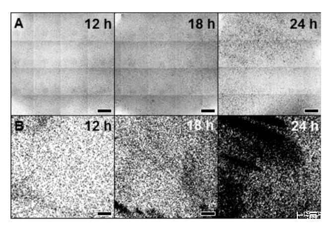 每個單獨(dú)圖像是拼接圖像集,顯示一個孔的中心表面——是由Cellavista評估的25張圖像的編譯。在研究天然化合物中,殼聚糖和黃芩素在低濃度下影響粘附或預(yù)形成生物膜,但地衣酸即使在300μg ml?1濃度下也未表現(xiàn)出足夠的抗生物膜特性,因此被排除其他測試(單因素方差分析:近平滑念珠菌粘附抑制P=0.67,生物膜發(fā)展P=0.014,預(yù)形成生物膜P=0.15)。生物膜排列在所有對照實驗中兩種研究微生物中均勻。在大多數(shù)情況下,物質(zhì)影響并均勻降低覆蓋區(qū)域,除黃芩素外,其存在導(dǎo)致簇形成(白圈高亮),即使總覆蓋區(qū)域降低,特別是在近平滑念珠菌生物膜發(fā)展實驗中(行B,第二列)。