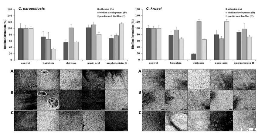 本研究選擇了已知干擾生物膜形成的天然物質(zhì)。低濃度黃芩素能夠抑制白念珠菌生物膜形成,殼聚糖對多種微生物表現(xiàn)出抗菌活性,包括白念珠菌生物膜。地衣酸被描述為近平滑念珠菌固著細(xì)胞生長的有效抑制劑。