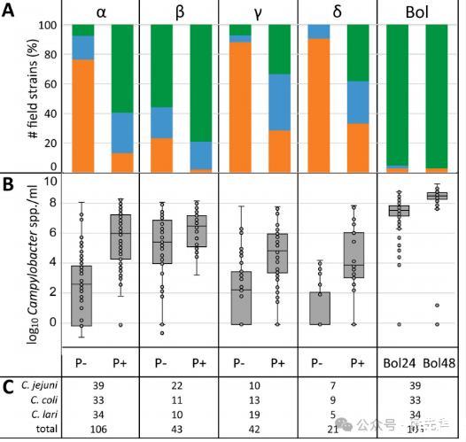 研究進一步將不同彎曲桿菌分離株接種于四種富集條件:博爾頓肉湯、普雷斯頓肉湯(±FBP),并在48小時后評估生長情況(圖2)。博爾頓肉湯表現(xiàn)出極強的富集能力,除7%的C.jejuni外,其余菌株均為陽性,最終濃度高達8.8–9.4 log??CFU/mL。這證實了其作為“通用型”富集液的可靠性。