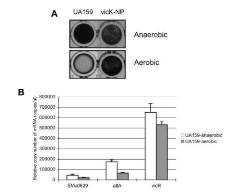 圖6. 變異鏈球菌菌株(UA159和vicK-NP)需氧生長效應(yīng)。需氧培養(yǎng)采用旋轉(zhuǎn)搖床(150 rpm)進(jìn)行。(A)生物膜形成。菌株在添加20 mM蔗糖的BM培養(yǎng)基中生長,通過結(jié)晶紫染色法在聚苯乙烯微孔板上檢測生物膜形成情況。(B)采用實(shí)時(shí)熒光定量PCR技術(shù)檢測需氧生長條件下變異鏈球菌UA159中SMu0629、atlA和vicR基因的差異表達(dá)。數(shù)據(jù)顯示為三次及以上獨(dú)立重復(fù)實(shí)驗(yàn)的平均值±標(biāo)準(zhǔn)差。*表示P<0.02(學(xué)生t檢驗(yàn))。