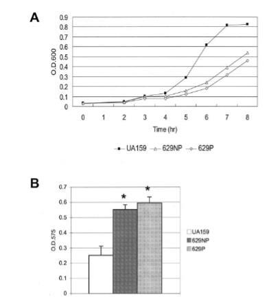 圖4. 變形鏈球菌菌株(UA159、629NP和629P)需氧生長的影響。需氧培養(yǎng)采用旋轉(zhuǎn)搖床(150 rpm)進(jìn)行。(A)生長曲線。菌株在37°C的BHI培養(yǎng)基中生長,所示數(shù)據(jù)來自三次獨(dú)立實(shí)驗(yàn)中具有代表性的一次實(shí)驗(yàn),且三次實(shí)驗(yàn)結(jié)果一致。(B)生物膜形成。菌株在補(bǔ)充有終濃度為20 mM葡萄糖的BM培養(yǎng)基中,通過搖床(150 rpm)進(jìn)行需氧培養(yǎng)。更多細(xì)節(jié)見正文。數(shù)據(jù)代表至少兩次獨(dú)立實(shí)驗(yàn)(每次實(shí)驗(yàn)重復(fù)三次或以上)的結(jié)果。誤差棒表示標(biāo)準(zhǔn)差。*,P < 0.001(學(xué)生t檢驗(yàn))。