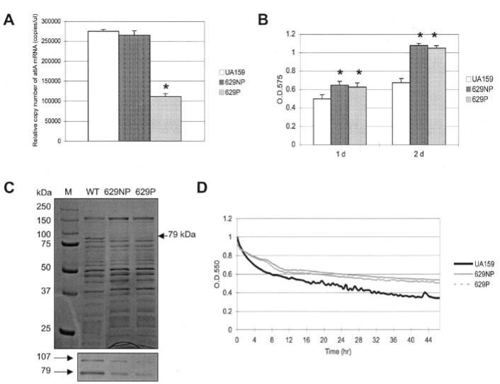 圖3. SMu0629突變體(非極性突變629NP和極性突變629P)的表型特征分析。(A)通過實(shí)時(shí)熒光定量PCR監(jiān)測atlA基因表達(dá)。使用UA159(野生型)、629NP和629P菌株的總RNA,采用630反向引物進(jìn)行逆轉(zhuǎn)錄反應(yīng)測定atlA mRNA。(B)生物膜形成能力。菌株在補(bǔ)充葡萄糖的BM培養(yǎng)基中培養(yǎng)1或2天。數(shù)據(jù)代表至少進(jìn)行三次重復(fù)的兩次獨(dú)立實(shí)驗(yàn)。誤差線表示標(biāo)準(zhǔn)差。*表示P<0.01(1天)或P<0.001(2天)(學(xué)生t檢驗(yàn))。(C)變異鏈球菌野生型(WT)和兩種SMu0629突變體(629NP和629P)的珠磨-SDS煮沸提取物SDS-PAGE分析。經(jīng)SDS-PAGE后,蛋白質(zhì)分別用考馬斯亮藍(lán)染色(上圖)或轉(zhuǎn)印至硝酸纖維素膜并使用1:350稀釋度的抗630D1多克隆抗血清進(jìn)行Western blotting(下圖)。M為分子量標(biāo)準(zhǔn)。(D)自溶實(shí)驗(yàn)。菌株自溶活性在Bioscreen C系統(tǒng)中監(jiān)測,該系統(tǒng)設(shè)置為每30分鐘檢測前震蕩15秒。細(xì)胞懸浮液在AtlA自溶最適溫度(44°C)下培養(yǎng)。黑色線:UA159;灰色線:629NP;灰色虛線:629P。