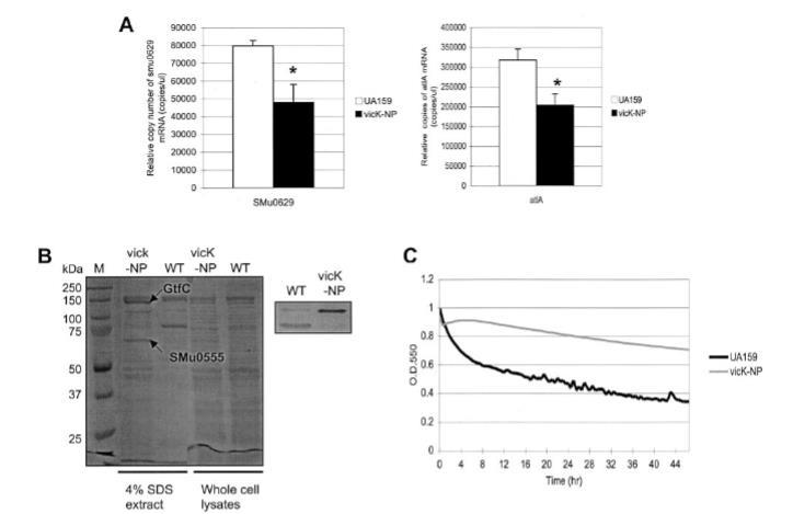 有趣的是,從4% SDS提取部分明顯看出,幾種蛋白質(zhì)的表達(dá)或定位在vicK突變體中顯著受影響。特別值得注意的是,兩個條帶,大約150 kDa和70 kDa,在突變體中比野生型菌株數(shù)量多得多(圖5B)。為了鑒定這兩個條帶,將它們從染色凝膠中切下,并通過基質(zhì)輔助激光解吸電離-飛行時(shí)間質(zhì)譜分析胰蛋白酶消化模式。較大的條帶被鑒定為GtfC,較小的蛋白質(zhì)被鑒定為與戈登鏈球菌推定N-乙酰胞壁酰胺酶/溶素和肺炎鏈球菌膽堿結(jié)合蛋白D同源的細(xì)胞壁蛋白前體蛋白(SMu0555)。因此,這些結(jié)果表明Vic系統(tǒng)直接或間接控制毒力因子的定位或表達(dá),包括Gtfs和自溶素。