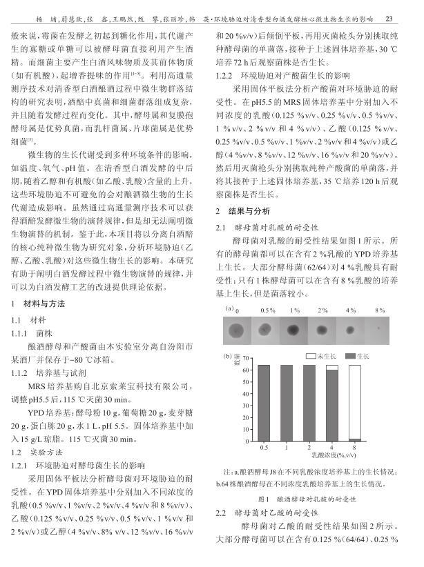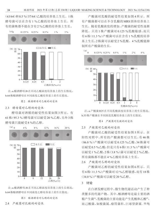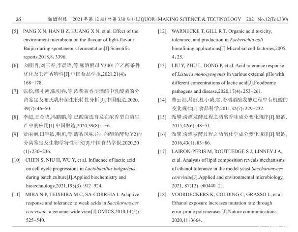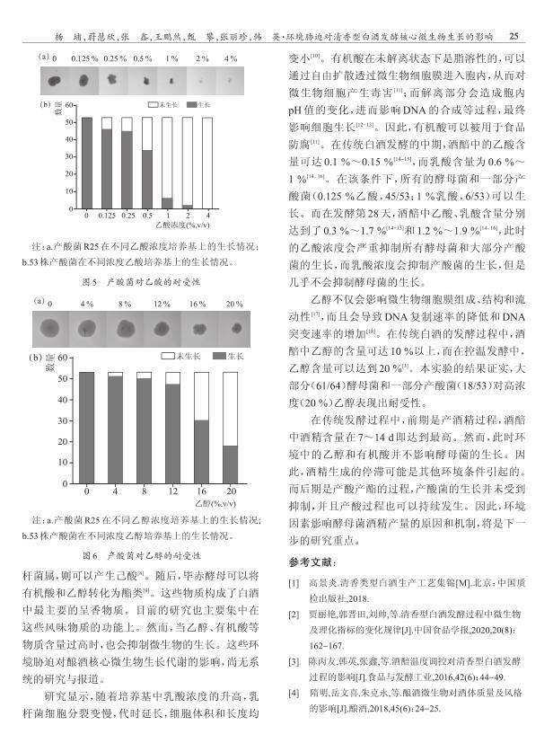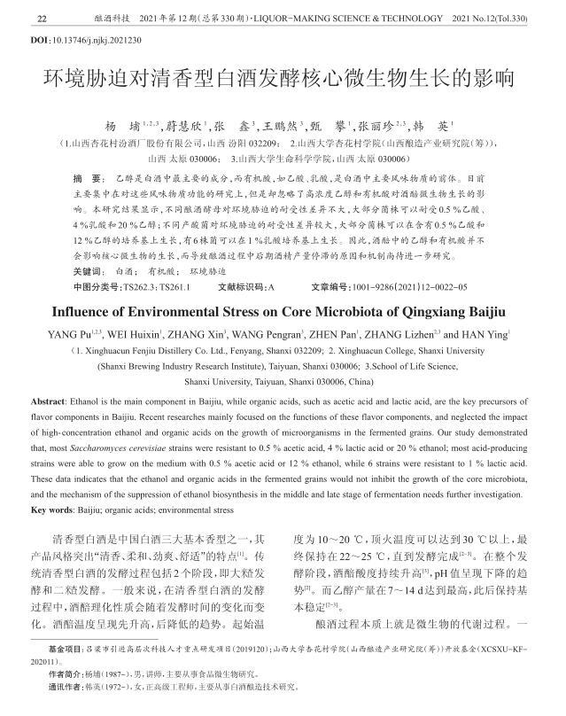 【摘要】:乙醇是白酒中最主要的成分,而有機酸,如乙酸、乳酸,是白酒中主要風味物質的前體。目前主要集中在對這些風味物質功能的研究上,但是卻忽略了高濃度乙醇和有機酸對酒醅微生物生長的影響。本研究結果顯示,不同釀酒酵母對環(huán)境脅迫的耐受性差異不大,大部分菌株可以耐受0.5%乙酸、4%乳酸和20%乙醇;不同產酸菌對環(huán)境脅迫的耐受性差異較大,大部分菌株可以在含有0.5%乙酸和12%乙醇的培養(yǎng)基上生長,有6株菌可以在1%乳酸培養(yǎng)基上生長。因此,酒醅中的乙醇和有機酸并不會影響核心微生物的生長,而導致釀酒過程中后期酒精產量停滯的原因和機制尚待進一步研究。