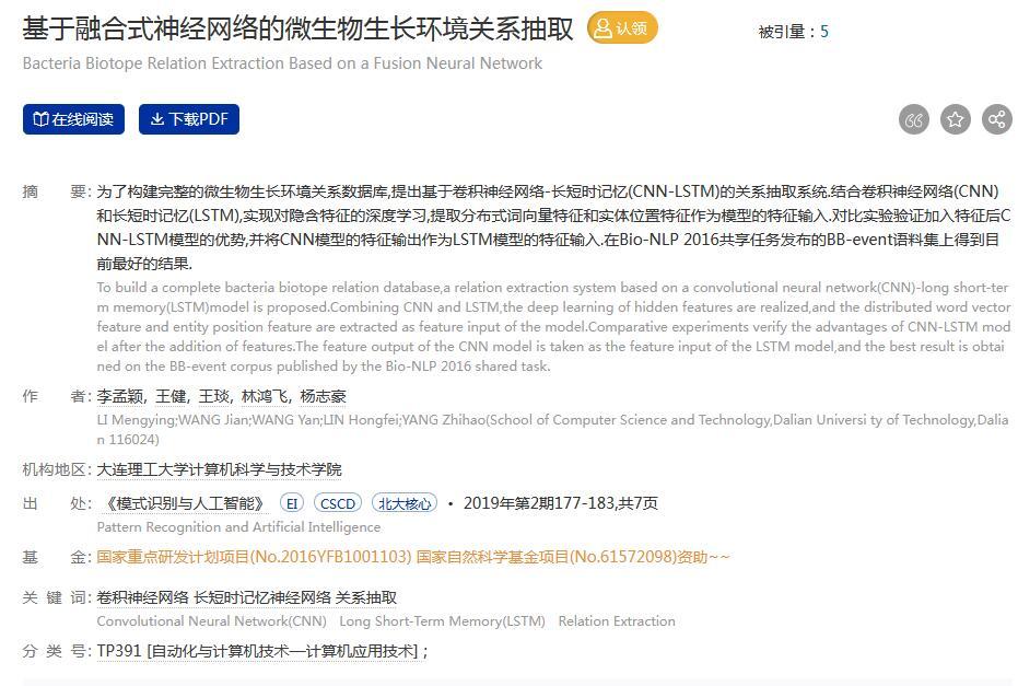 【摘要】:為了構(gòu)建完整的微生物生長環(huán)境關(guān)系數(shù)據(jù)庫,提出基于卷積神經(jīng)網(wǎng)絡(luò)-長短時記憶(CNN-LSTM)的關(guān)系抽取系統(tǒng)。結(jié)合卷積神經(jīng)網(wǎng)絡(luò)(CNN)和長短時記憶(LSTM),實現(xiàn)對隱含特征的深度學習,提取分布式詞向量特征和實體位置特征作為模型的特征輸入。對比實驗驗證加入特征后CNN-LSTM模型的優(yōu)勢,并將CNN模型的特征輸出作為LSTM模型的特征輸入。在Bio-NLP 2016共享任務(wù)發(fā)布的BB-event語料集上得到目前最好的結(jié)果。
