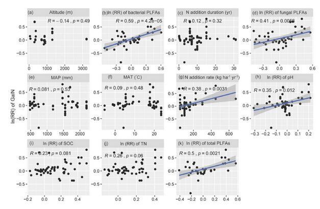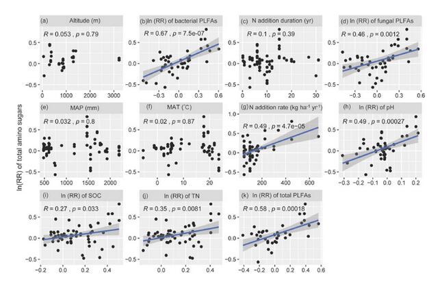 2.氨基糖的響應(yīng)與微生物PLFAs、TN、pH、SOC、N添加速率、N添加時(shí)間的相關(guān)性,以及在MAP、MAT和海拔的變化