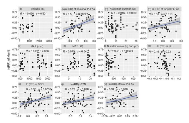 圖5 MurN的自然對(duì)數(shù)響應(yīng)比ln(RR)與微生物PLFA、TN、pH、SOC的自然對(duì)數(shù)響應(yīng)比ln(RR)之間的線性關(guān)系等