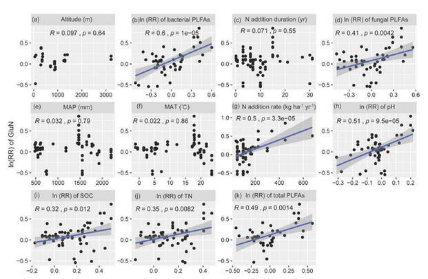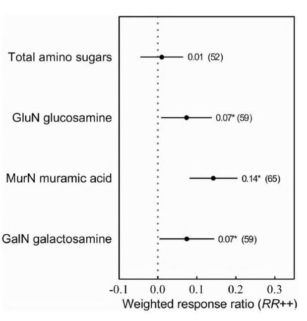 關(guān)于氨基糖對(duì)N沉降的響應(yīng),目前還沒(méi)有共識(shí),研究表明,N沉降對(duì)氨基糖的影響是正面、負(fù)面或中性。這些不一致的模式可能歸因于模擬N沉降速率的差異以及真菌和細(xì)菌生長(zhǎng)所需N的差異。全球N肥的使用深刻影響了微生物群落和殘?bào)w產(chǎn)量。此外,在大多數(shù)農(nóng)業(yè)系統(tǒng)中,也會(huì)施用其他養(yǎng)分,如磷(P)和鉀(K);在這種情況下,觀察到的效應(yīng)不能僅僅歸因于N輸入。綜上所述,在不同生物群落中,N沉降和N肥施用對(duì)土壤微生物殘?bào)w的影響尚缺乏共識(shí)。