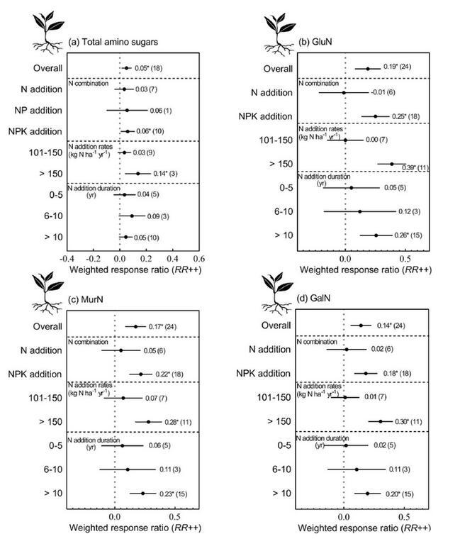 人工N輸入的增加改變了全球土壤碳儲(chǔ)量,但微生物殘?bào)w(氨基糖)對(duì)添加N的土壤碳的貢獻(xiàn)尚不清楚。在此,我們對(duì)32篇文獻(xiàn)進(jìn)行了meta分析,并評(píng)估了N添加對(duì)微生物殘?bào)w量的影響。結(jié)果表明,N添加的總體效應(yīng)顯著提高了真菌(葡萄糖胺,GluN)和細(xì)菌(胞壁酸,MurN;半乳糖胺,GalN)殘?bào)w;但對(duì)微生物總殘?bào)w量(總氨基糖)無(wú)顯著影響。N添加對(duì)氨基糖的影響與生態(tài)系統(tǒng)類型有關(guān)。N添加增加了農(nóng)田中GluN、MurN、GalN和總氨基糖的含量,而在森林中N添加僅增加了MurN的含量。在農(nóng)田中,施N對(duì)微生物殘?bào)w含量的影響取決于施N是單獨(dú)施N還是與磷鉀復(fù)合施N。其中,施N對(duì)細(xì)菌MurN、GalN、真菌GluN和總氨基糖含量無(wú)顯著影響。而添加NPK顯著提高了所有個(gè)體(GluN、MurN和GalN)和總氨基糖含量。此外,高施N量(>150 kg N ha1 yr1)和長(zhǎng)期施N量(>10年)顯著提高了農(nóng)田各氨基糖和總氨基糖的含量,這可能是由于高施N量和長(zhǎng)期施N刺激了微生物的生長(zhǎng)。我們的研究結(jié)果表明,N添加增加了農(nóng)田微生物殘?bào)w量和森林細(xì)菌殘?bào)w量,為全球持續(xù)的人為N輸入改善微生物源碳的封存提供了重要信息。