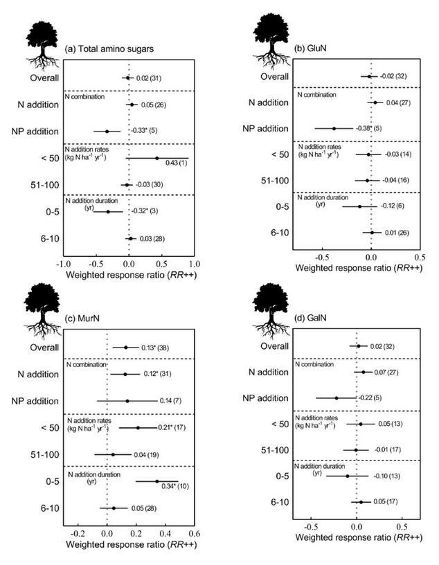 圖3森林生態(tài)系統(tǒng)中總氨基糖(a)、GluN(b)、MurN(c)和GalN(d)含量對(duì)N添加的加權(quán)響應(yīng)比和95%置信區(qū)間