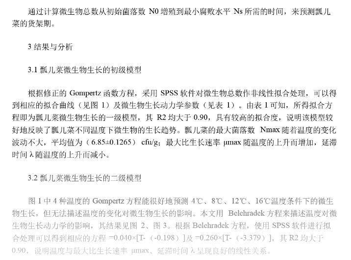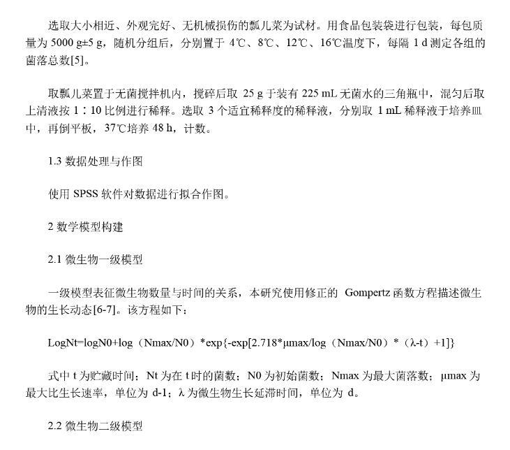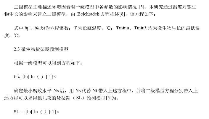 【摘要】:以采后瓢兒菜為試驗對象,研究了不同貯藏溫度下瓢兒菜的微生物生長趨勢,建立了瓢兒菜微生物生長動力學模型和微生物貨架期預測模型。結果表明:修正的Gompertz方程能夠較好地擬合不同溫度下瓢兒菜微生物生長的初級模型,其R~2均大于0.90;瓢兒菜的最大菌數(shù)Nmax隨溫度的變化波動不大,平均值為(6.85±0.1265)cfu/g;最大比生長速率μmax隨溫度的上升而增加,生長延滯時間λ隨溫度的上升而減?。欢壞P蜑?0.040×[T-(-0.198)]及=0.260×[T-(-3.379)],其R2均大于0.90。通過初級模型和二級模型確立了瓢兒菜的微生物貨架期預測模型。