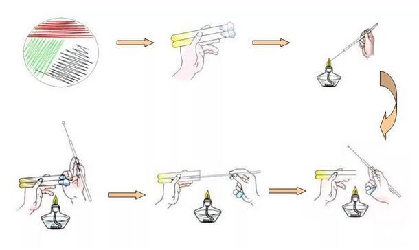 (1)接種滅菌(2)開啟棉塞(3)管口滅菌(4)挑起菌苔(5)接種(6)塞好棉塞。