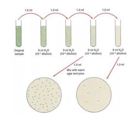 首先把微生物懸液通過一系列稀釋,取一定量的稀釋液與熔化好的保持在40-50°左右的營養(yǎng)瓊脂培養(yǎng)基充分混合,然后把這混合液傾注到無菌的培養(yǎng)皿中,待凝固之后,把這平板倒置在恒箱中培養(yǎng)。單一細(xì)胞經(jīng)過多次增殖后形成一個(gè)菌落,取單個(gè)菌落制成懸液,重復(fù)上述步驟數(shù)次,便可得到純培養(yǎng)物。