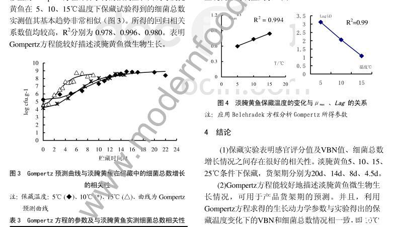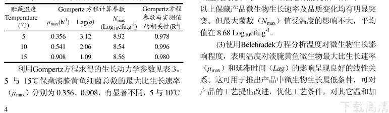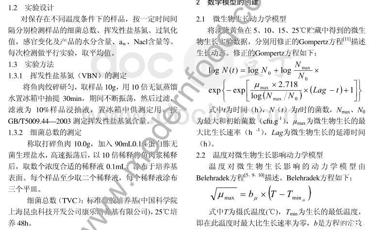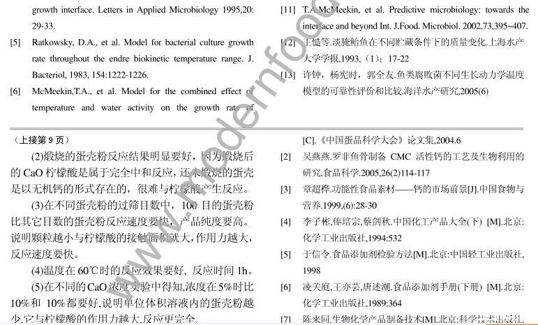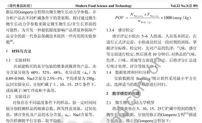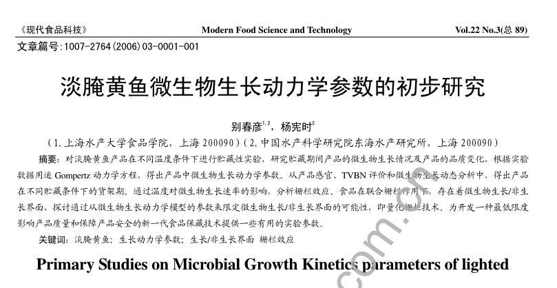 【摘要】:對(duì)淡腌黃魚產(chǎn)品在不同溫度條件下進(jìn)行貯藏性實(shí)驗(yàn),研究貯藏期間產(chǎn)品的微生物生長(zhǎng)情況及產(chǎn)品的品質(zhì)變化,根據(jù)實(shí)驗(yàn)數(shù)據(jù)用運(yùn)Gompertz動(dòng)力學(xué)方程,得出產(chǎn)品中微生物生長(zhǎng)動(dòng)力學(xué)參數(shù)。從產(chǎn)品感官、TVBN評(píng)價(jià)和微生物生長(zhǎng)動(dòng)態(tài)分析中,得出產(chǎn)品在不同貯藏條件下的貨架期。通過溫度對(duì)微生物生長(zhǎng)速率的影響,分析柵欄效應(yīng)。食品在聯(lián)合柵欄作用下,存在著微生物生長(zhǎng)/非生長(zhǎng)界面,探討通過從微生物生長(zhǎng)動(dòng)力學(xué)模型的參數(shù)來(lái)限定微生物生長(zhǎng)/非生長(zhǎng)界面的可能性,即量化柵欄技術(shù)。為開發(fā)一種最低限度影響產(chǎn)品質(zhì)量和保障產(chǎn)品安全的新一代食品保藏技術(shù)提供一些有用的實(shí)驗(yàn)參數(shù)。