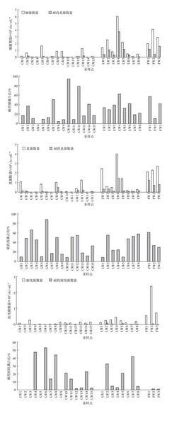 圖2洪湖養(yǎng)殖區(qū)水環(huán)境中微生物和耐藥微生物數(shù)量及其耐藥占比的分布