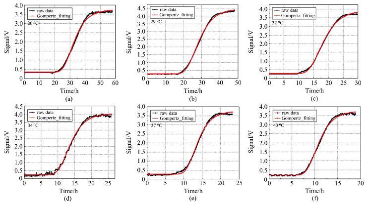 實(shí)驗(yàn)在不同溫度(a)26°C,(b)29°C,(c)32°C,(d)34°C,(e)37°C,(f)43°C下測(cè)量的大腸桿菌生長曲線及Gompertz模型擬合情況
