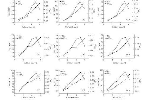 圖1朱氏四爿藻(A)、心形四爿藻(B)、大四爿藻(C)的生長曲線(根據幾組特定光密度值繪制)