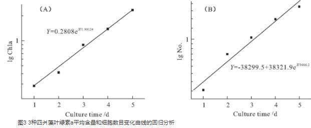 采用Origin v6.0作圖,分析生長曲線的差異,并對3種四爿藻據葉綠素a的平均含量繪制的生長曲線進行回歸,并與細胞計數法得到的生長曲線回歸結果進行比較。