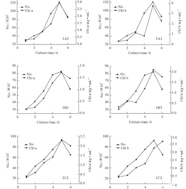 圖2朱氏四爿藻(A)、心形四爿藻(B)、大四爿藻(C)的生長曲線(根據葉綠素a、b含量繪制)