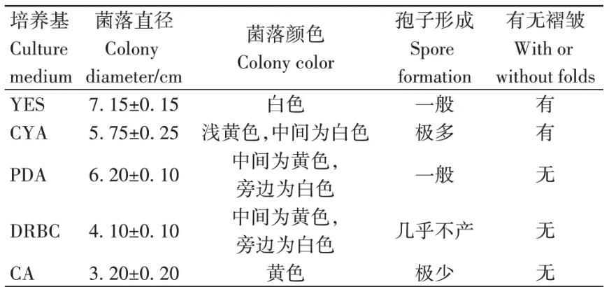 由表1可知,硫色曲霉在YES培養(yǎng)基上生長最快,菌落直徑最大,為7.15 cm,且有褶皺,菌絲發(fā)達(dá),適宜用于觀察硫色曲霉的生長情況。硫色曲霉在PDA和CYA培養(yǎng)基上的生長速度僅次于YES培養(yǎng)基,菌落直徑分別為6.20和5.75 cm,這兩種培養(yǎng)基適用于硫色曲霉生長特性的研究,且CYA培養(yǎng)基孢子產(chǎn)量最高,適于孢子計(jì)數(shù)。硫色曲霉在DRBC和CA培養(yǎng)基上長勢(shì)相對(duì)較慢,且無褶皺,菌落直徑分別為4.10和3.20 cm,DRBC培養(yǎng)基上幾乎不產(chǎn)生孢子,這兩種培養(yǎng)基不適宜觀察硫色曲霉的生長特性,但可用于硫色曲霉的分離和計(jì)數(shù)。