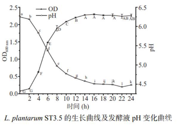 L.plantarum ST3.5的生長曲線和pH變化曲線如圖2,由圖可見,該菌株在測定時(shí)間內(nèi)OD值先迅速增加后趨于平穩(wěn)。在2 h左右,因?yàn)橛谐渥銧I養(yǎng)物質(zhì),所以乳酸菌迅速進(jìn)入對數(shù)生長期,開始大量繁殖,同時(shí)OD600 nm值增加,在16 h左右,隨著乳酸菌的生長和繁殖,產(chǎn)生了大量的代謝產(chǎn)物,大量的營養(yǎng)物質(zhì)被消耗殆盡,隨后停止了對數(shù)生長,進(jìn)入了穩(wěn)定期,并且在16~24 h期間OD值均保持穩(wěn)定。由于乳酸菌生長會(huì)產(chǎn)生酸性物質(zhì),所以L.plantarum ST3.5前16 h的pH從6.25迅速下降到4.51,在16~24 h期間乳酸菌停止生長和繁殖,所以pH無顯著變化(P>0.05),趨于穩(wěn)定。