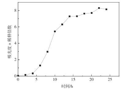 (3)酵母菌的生長曲線。從搖晃均勻后的酵母菌YEPD液體培養(yǎng)基中無菌取出菌液,加入到滅菌過的新鮮YEPD液體培養(yǎng)基中,每間隔2 h測定吸光度數(shù)值,最終測得24 h的吸光度,用稀釋后的混合液吸光度乘以相應(yīng)的稀釋倍數(shù)得吸光度數(shù)值。以接種后0 h、2 h、4 h、6 h、8 h、10 h、12 h、14 h、16 h、18 h、20 h、22 h和24 h為橫坐標(biāo),以吸光度乘以相應(yīng)稀釋倍數(shù)為縱坐標(biāo),最終繪制出酵母細(xì)胞24 h的生長曲線。