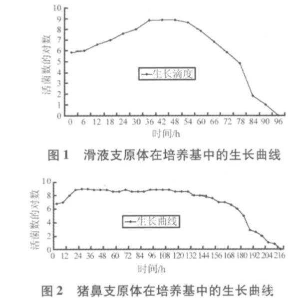 從圖1可知,滑液支原體菌株在接種后6 h內(nèi)為遲緩期,6~36 h為對數(shù)期,36~54 h為穩(wěn)定期,54 h之后為衰老期。從圖2可知,豬鼻支原體菌株在接種后6 h內(nèi)是遲緩期,6~18 h為對數(shù)期,18~126 h為穩(wěn)定期,126 h之后為衰老期。