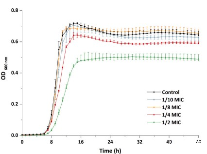 對(duì)于單核增生李斯特菌生長(zhǎng)過(guò)程測(cè)量,使在不存在或存在PLA(1/10MIC、1/8MIC、1/4MIC和1/2MIC)的情況下,將單核細(xì)胞增生李斯特菌10403S接種到BHI肉湯中。將菌株的五個(gè)菌落分別接種到BHI肉湯中并孵育。然后將細(xì)菌培養(yǎng)物在補(bǔ)充有不同濃度PLA的BHI中稀釋。將樣品在用Bioscreen C全自動(dòng)生長(zhǎng)曲線分析儀(芬蘭)中在37°C下孵育48小時(shí),每小時(shí)測(cè)量一次OD 600nm,生成細(xì)菌的微生物生長(zhǎng)曲線。