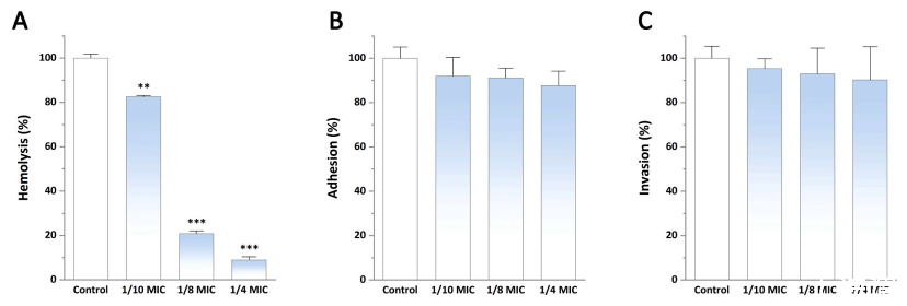 圖4、PLA對(duì)(A)溶血活性、(B)附著能力和(C)侵入Caco-2細(xì)胞的影響。