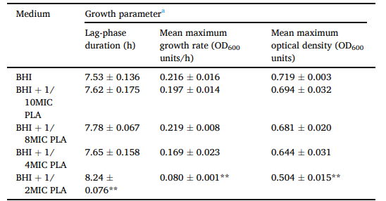 圖1、核細(xì)胞增生李斯特菌10403S在不同濃度PLA的BHI中的生長(zhǎng)曲線。當(dāng)暴露于1/2MIC的PLA時(shí),菌株生長(zhǎng)受損,滯后期延長(zhǎng)9.5%(P<0.05),最大生長(zhǎng)速率降低62.8%。