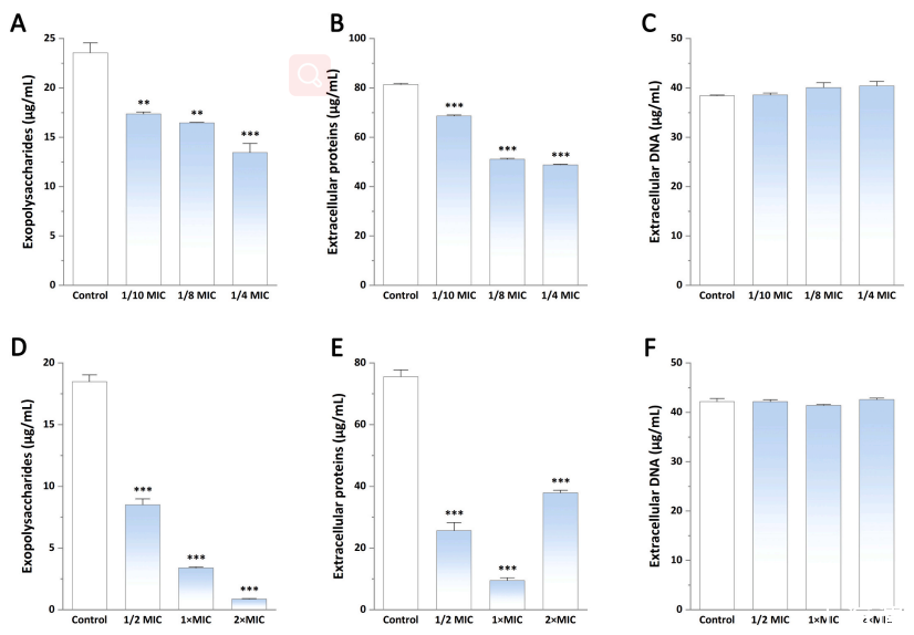 圖3、PLA對(duì)單核細(xì)胞增生李斯特菌10403S生物膜基質(zhì)中EPS含量的影響。將生物膜在PLA(分別為1/10MIC、1/8MIC和1/4MIC)存在下孵育48小時(shí),然后將生物膜中(A)胞外多糖、(B)細(xì)胞外蛋白和(C)細(xì)胞外DNA的量被確定了。在暴露于PLA(分別為1/2MIC、1×MIC和2×MIC)4小時(shí)后,對(duì)成熟生物膜中(D)胞外多糖、(E)胞外蛋白和(F)胞外DNA的含量進(jìn)行定量。