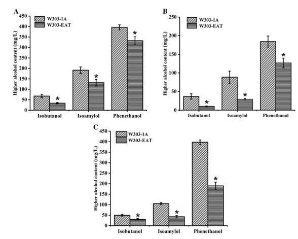 圖4、W303-1A和W303-EAT不同低度酒[玫瑰酒(A)、藍(lán)莓酒(B)和黃酒(C)]中較高酒精含量的比較。星號(*)表示不同低度酒的酒精度較高,差異顯著。從圖中看出與W303-1A相比,重組菌株W303-EAT對低發(fā)酵葡萄酒中異丁醇、異戊醇和苯乙醇的含量降低有顯著性差異(P<0.05),表明重組菌株W303-EAT具有具有特殊的還原高級醇的作用,對改善酒的風(fēng)味具有重要意義。