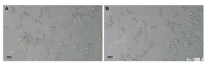 圖2、W303-1A(A)和W303-EAT(B)的細(xì)胞顯微形態(tài)。兩株菌株均為卵圓形,呈典型的單細(xì)胞形態(tài),無胞間連鎖,細(xì)胞大小無明顯差異,充分說明EAT基因的克隆和表達(dá)對其細(xì)胞形態(tài)無不良影響。