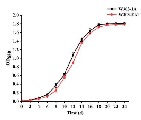 將重組菌株W303-EAT及其親本W(wǎng)303-1A在50 mL YPD培養(yǎng)基中以30°C和160 rpm預(yù)培養(yǎng)12 h,然后轉(zhuǎn)移到含有重組菌株W303-EAT或其親本W(wǎng)303的1 mL YPD培養(yǎng)基中-1A放入100 mL YPD培養(yǎng)基中,在30°C和160 rpm下培養(yǎng)24小時。使用Bioscreen全自動微生物生長曲線分析儀(每2小時測定一次光密度(OD 680)。