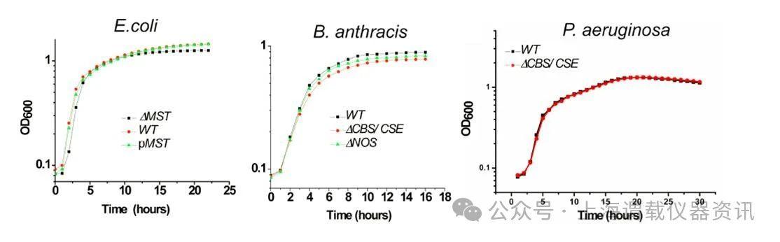 圖2、Wt細胞和硫化氫生成酶MST、CBS、CSE對大腸桿菌、銅綠假單胞菌、金黃色葡萄球菌生長的影響。應(yīng)用Bioscreen生長曲線分析儀測試這些菌的OD600隨時間變化的情況。