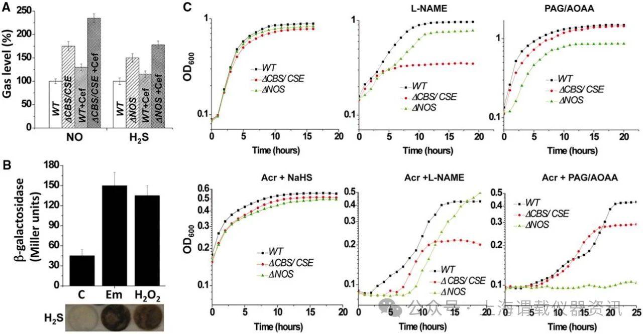 圖5、炭疽桿菌中硫化氫和一氧化氮的協(xié)同作用。(A)內(nèi)源性硫化氫和一氧化氮的補償性誘導作用。(B)硫化氫的誘導對于抗生素(紅霉素)或雙氧水響應(yīng),縱坐標代表了β-乳糖苷酶活性(C)不同菌類的OD生長曲線圖,其中各種菌株培養(yǎng)是使用了LB培養(yǎng)基和半胱氨酸。