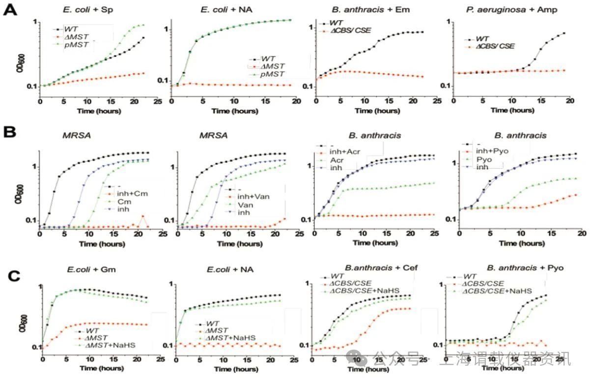 圖3、大腸桿菌、綠膿桿菌、金黃色葡萄球菌、炭疽桿菌與不同抗生素混合培養(yǎng)后,體系中含有各種硫化氫生成酶(黑線和綠線)和不含有硫化氫生成酶(紅線)的細菌的生長曲線圖。通過分析其各種細菌的生長曲線,可以看出,當體系中含有硫化氫生成酶時,細菌可以抵抗各種抗生素的殺菌作用。