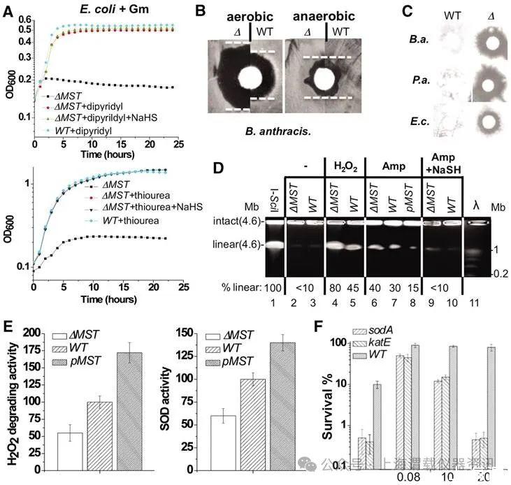 圖1、硫化氫對于抗生素殺菌性能的抑制。(A)硫化氫的作用是通過減少體系內(nèi)的活性氧(ROS)實現(xiàn)對于抗生素毒性的調(diào)節(jié)。大腸桿菌中加入了鐵離子螯合劑(2-聯(lián)吡啶)或者是活性氧去除劑硫脲。細菌的培養(yǎng)是在溫度為37度環(huán)境下使用了Bioscreen C全自動生長曲線分析系統(tǒng)實現(xiàn)對于各種不同條件下的細菌的培養(yǎng)、OD值、生長曲線的測試。(B)內(nèi)源性硫化氫使細胞在你有氧環(huán)境中能夠抵御抗生素的殺菌,但是在無氧環(huán)境中卻無法避免。(C)內(nèi)源性硫化氫使細菌能夠抵御雙氧水。(D)DSBS染色體凝膠電泳分析圖。(E)硫化氫刺激對于植物提取物中的各種細菌的雙氧水的分解活性和SOD活性的影響。(F)硫化氫對于氧化應(yīng)激抵御的雙重保護。