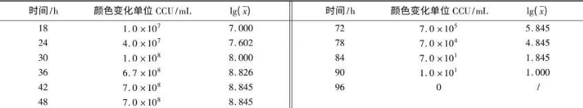 表1滑液支原體不同生長(zhǎng)時(shí)段的CCU及對(duì)數(shù)值