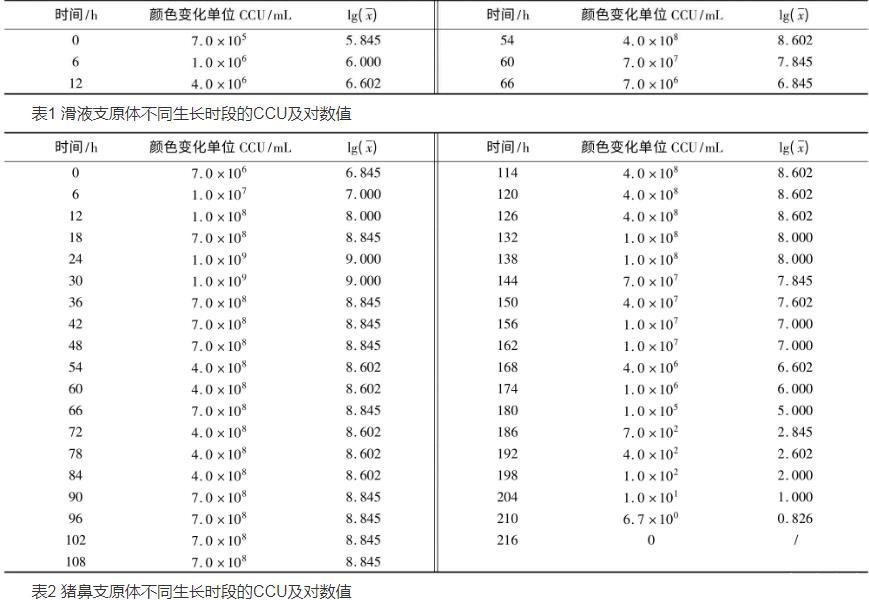 表2豬鼻支原體不同生長(zhǎng)時(shí)段的CCU及對(duì)數(shù)值