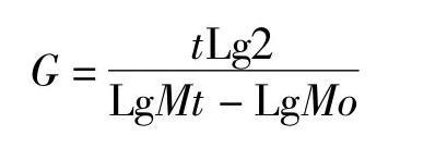 式中,G為世代時(shí)間,t為培養(yǎng)時(shí)間,Mo為開(kāi)始時(shí)的活菌數(shù),Mt為經(jīng)t時(shí)間培養(yǎng)后的活菌數(shù)。