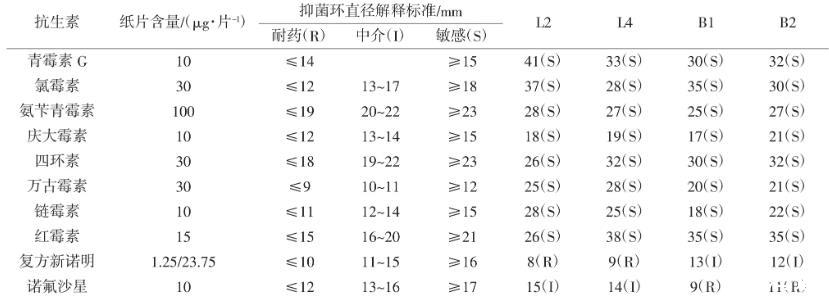 文獻(xiàn)[27-28]表明,微生物菌群間能傳遞細(xì)菌耐藥性的基因,從而使某種菌株獲得耐藥性,因此菌株在耐藥性的問(wèn)題上頗受關(guān)注?!端a(chǎn)動(dòng)物飼用乳酸菌篩選標(biāo)準(zhǔn)》和《水產(chǎn)動(dòng)物飼用芽孢桿菌篩選標(biāo)準(zhǔn)》規(guī)定,所篩選的菌株必須對(duì)水產(chǎn)動(dòng)物和人類(lèi)是無(wú)害的,且無(wú)抗生素耐藥性及致病性。采用10種抗生素對(duì)L2、L4、B1與B2菌株進(jìn)行藥物敏感測(cè)試,結(jié)果表明,4株菌株對(duì)復(fù)方新諾明與諾氟沙星2種藥物分別有一定程度的耐藥性,而對(duì)青霉素、氯霉素、慶大霉素、四環(huán)素等8種藥物表現(xiàn)敏感,檢測(cè)結(jié)果見(jiàn)表3。